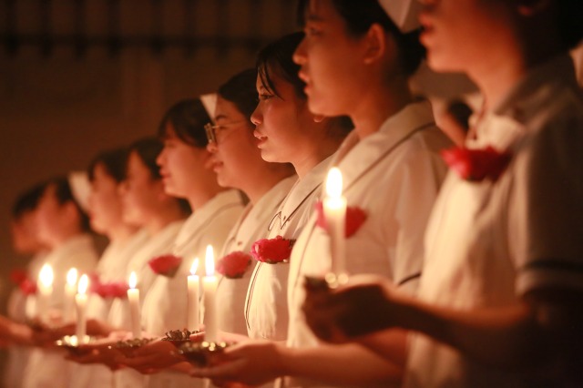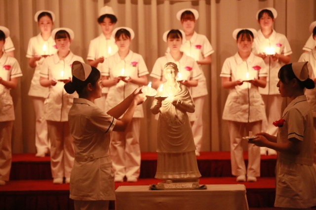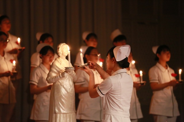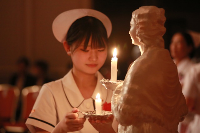 ナイチンゲール像から灯された「看護の灯」を受け取りながら、学生たちは看護師としての責任と使命を胸に刻みました。