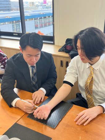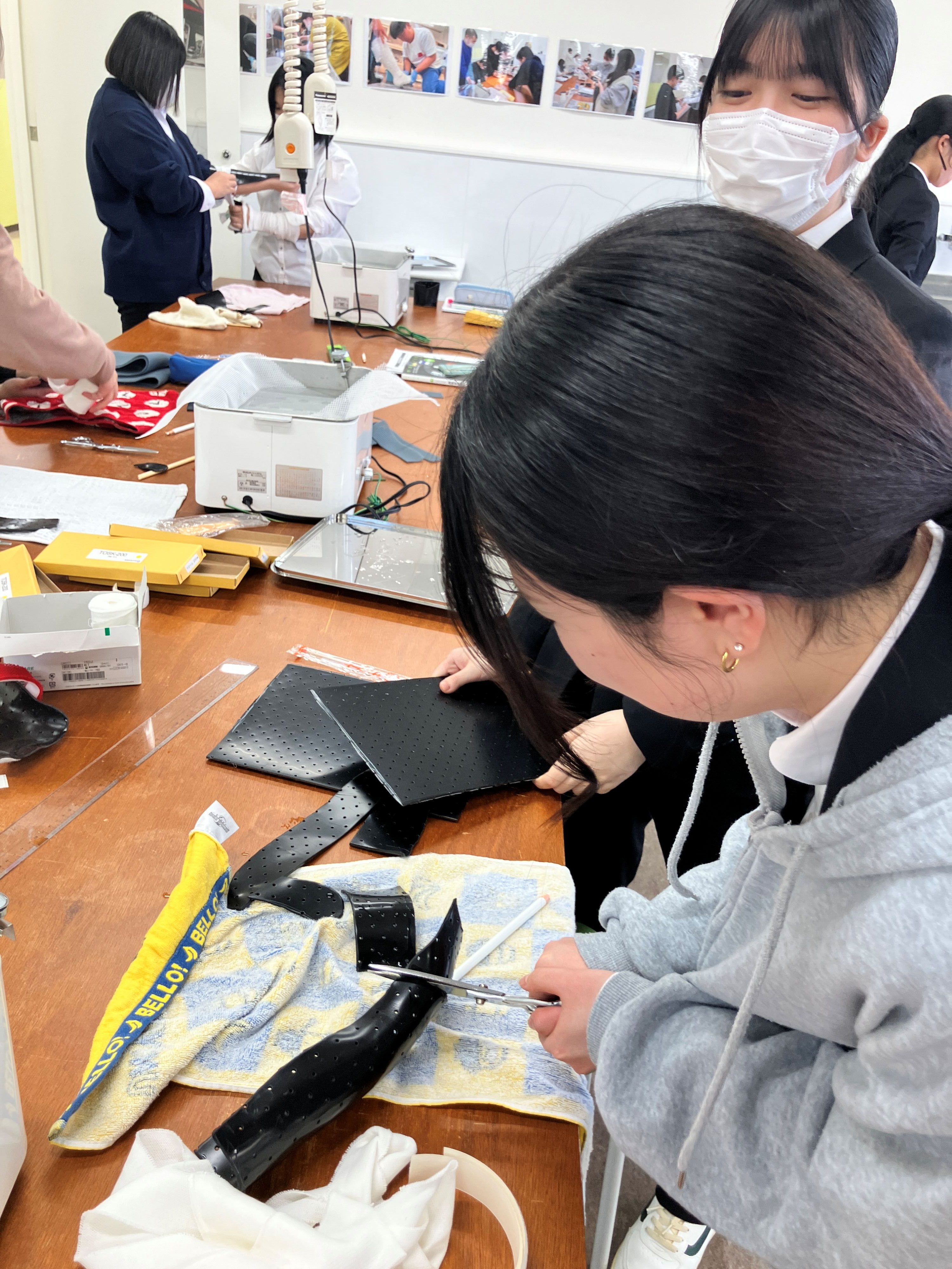 授業では、実際にプラスチック素材を温めて、手の形に合わせて成形する工程に取り組みました!
